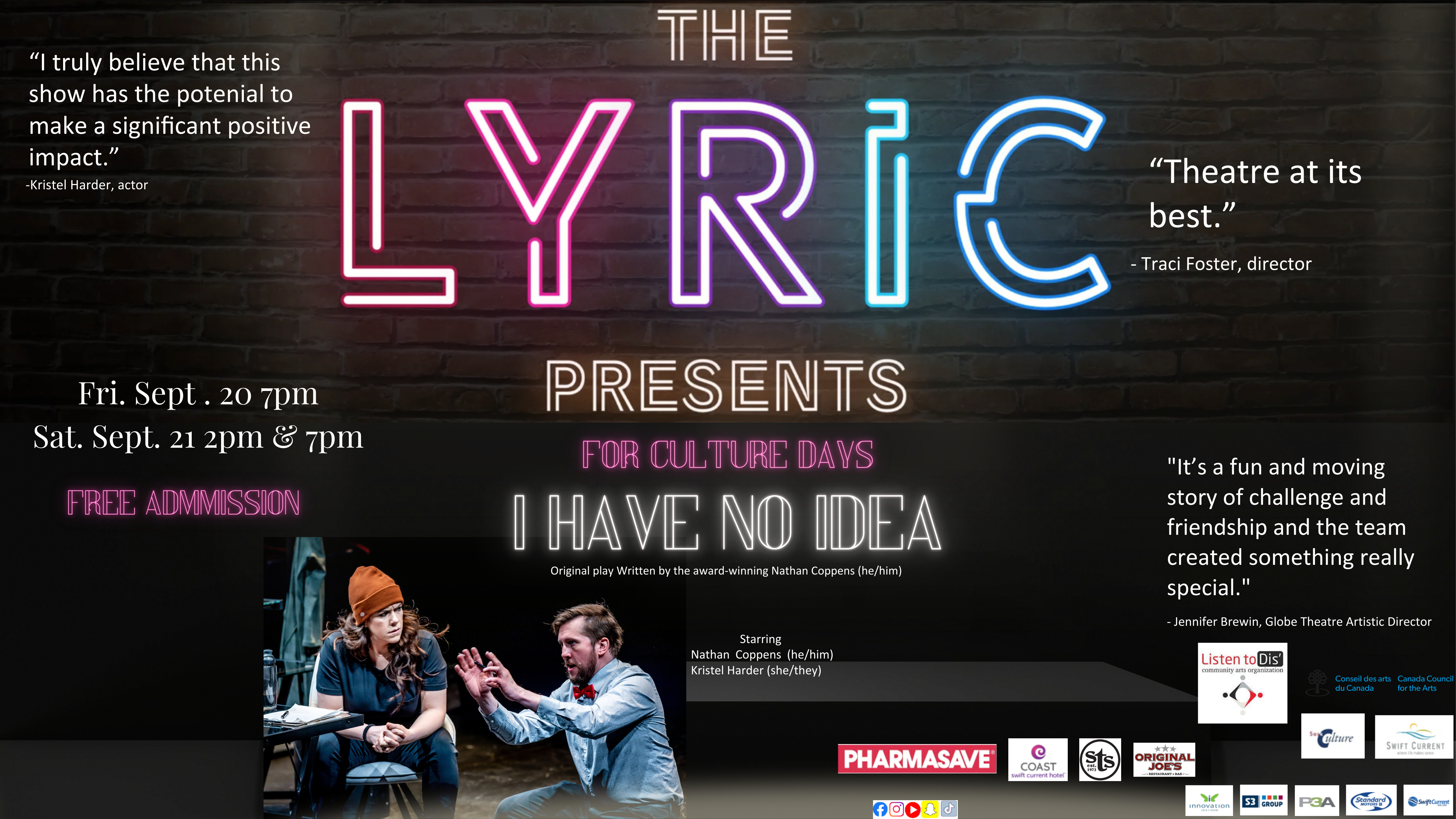 Written by the award-winning Nathan Coppens (he/him), directed by Traci Foster (she/they, Founder of Listen To Dis’ Community Arts Organization) and starring Nathan Coppens and Kristel Harder (she/they), I HAVE NO IDEA is a timely and relevant work based on the lived experiences of the playwright and interviewees, featuring a team of neurodivergent artists.