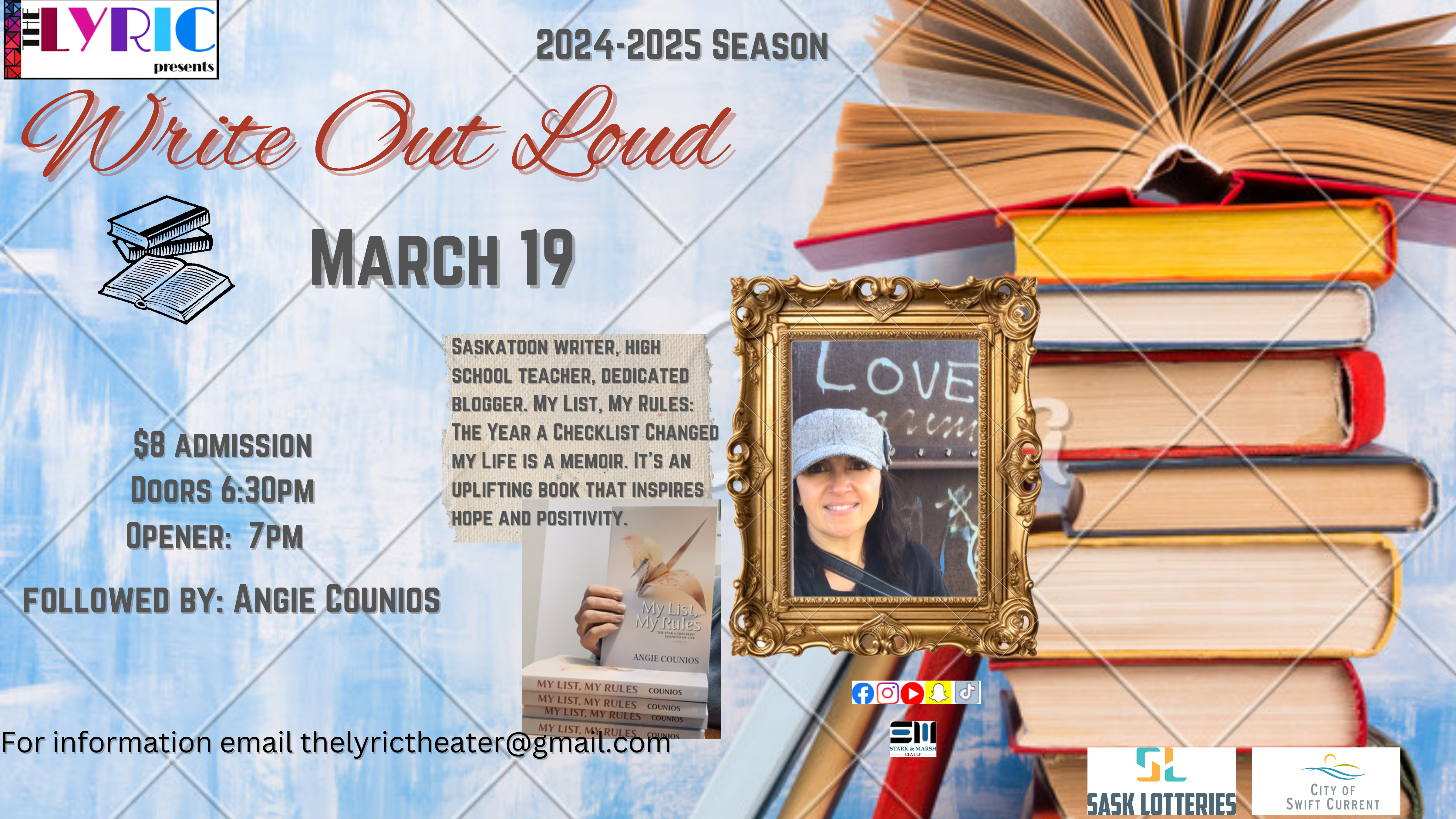 Angie Counios – Saskatoon writer, high school teacher, dedicated blogger, and co-author of the Shepherd and Wolfe mystery series for Young Adults. My List, My Rules: The Year a Checklist Changed my Life (YNWP, 2023) is more than a memoir which could also be categorized as self-help. It’s an uplifting book that inspires hope and positivity.